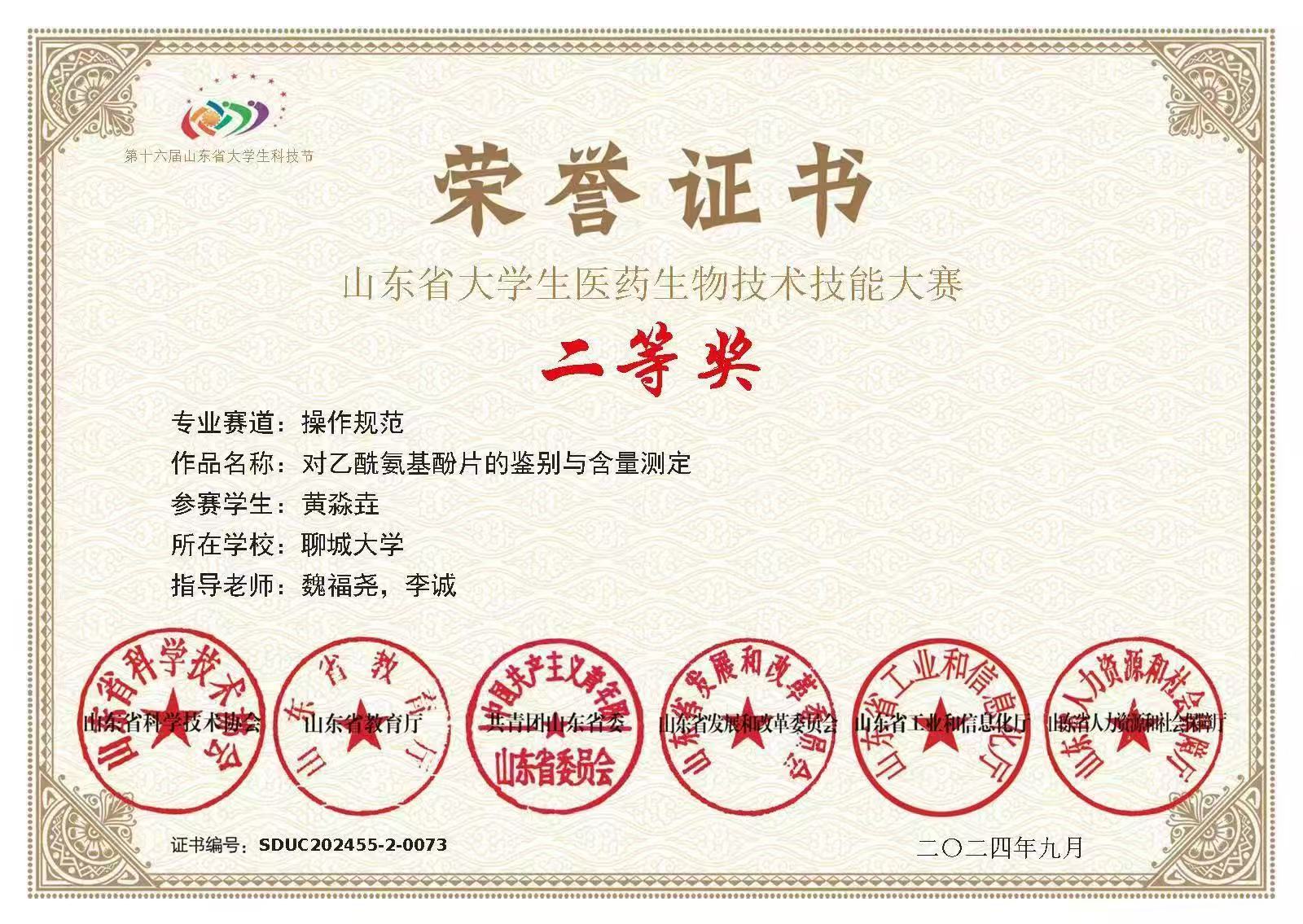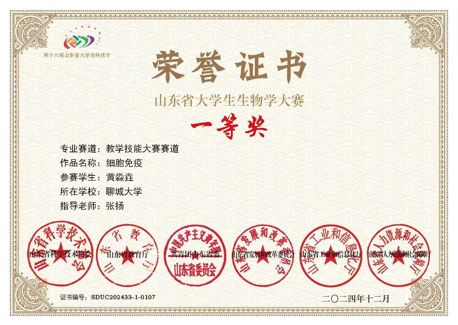 热烈祝贺药学与食品工程学院黄淼垚荣获全国大学生生命科学竞赛(2023,创新创业类)山东赛区竞赛一等奖
