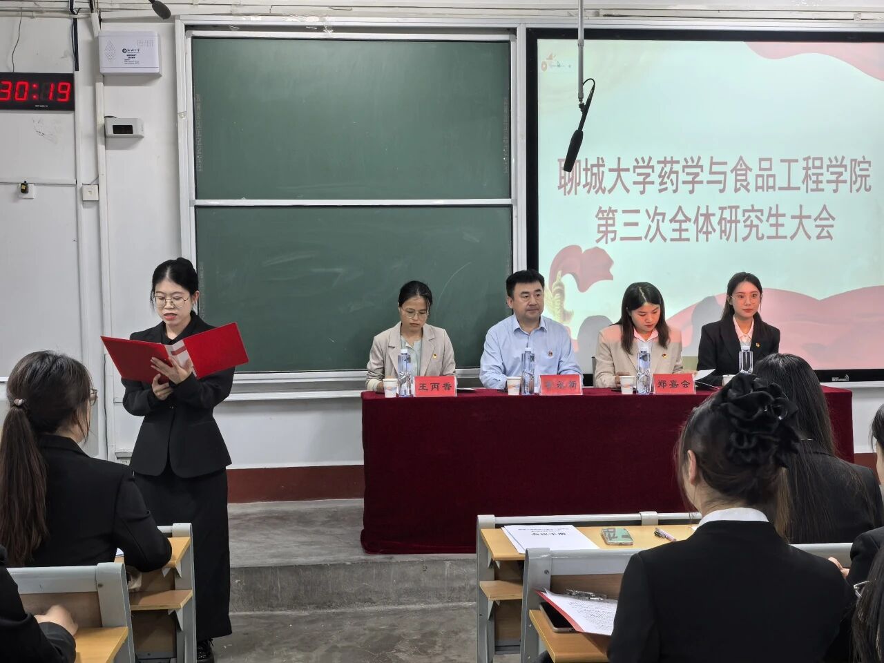 9月27日,我院于聊城大学东校区2号教学楼210教室召开药学与食品工程学院第三次全体研究生大会,学院党委副书记、副院长李永新、团委书记郑嘉会、学院研究生班班主任王丙香、校研究生会主席团成员李妍彤出席开幕式。