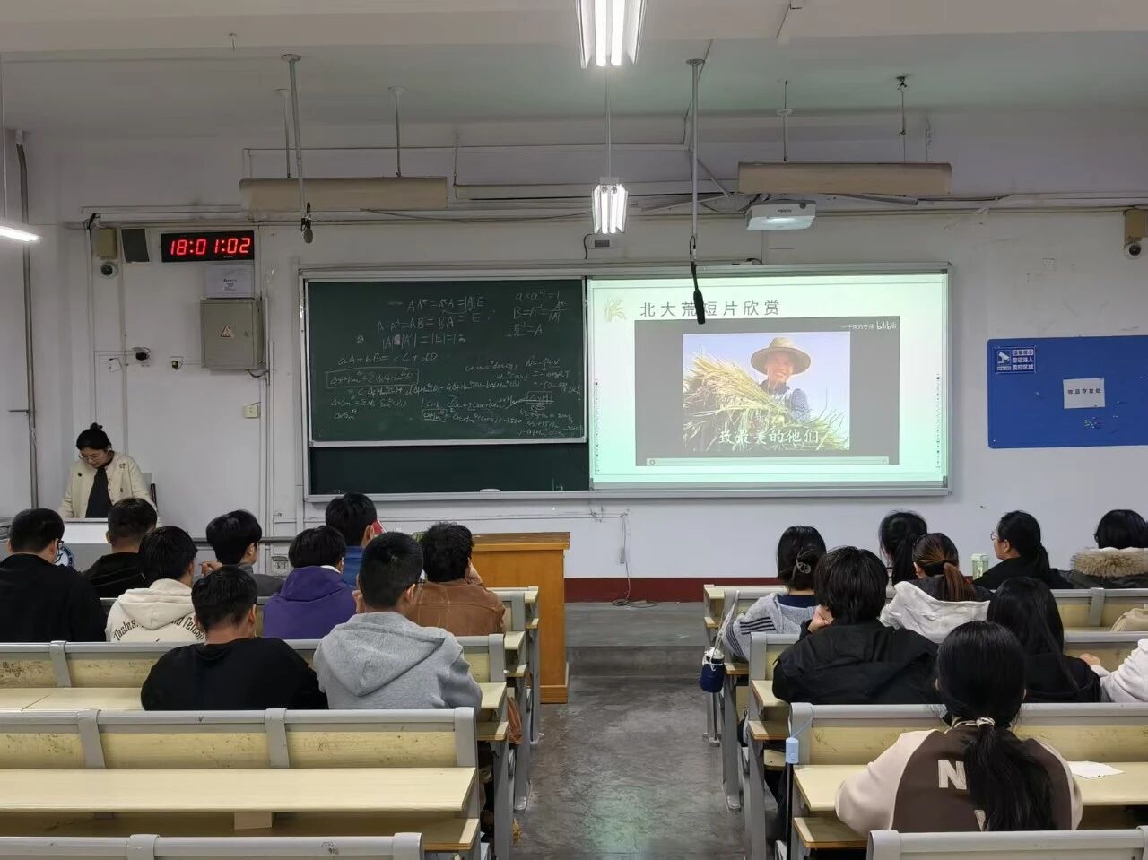 活动伊始,主讲人围绕“粮食从何而来”这一核心命题,明确阐述了活动主旨,并组织学生观看北大荒主题短片。黑土地上的耕耘与金色稻浪的丰收,让学生直观认识到每一粒粮食从田间地头到百姓餐桌的来之不易。在知识分享环节,主讲人介绍了世界粮食日的背景与宗旨,结合全球饥饿人口与粮食浪费数据,引导学生认识粮食系统的严峻挑战与粮食安全的战略意义。主讲人还通过深情讲述北大荒建设者们数十年如一日扎根荒原、垦荒拓土、躬耕不辍的感人事迹,引导学生深刻体悟“艰苦奋斗、无私奉献”的垦荒精神内涵,让学生深切感受到当前国家粮食安全成果的珍贵与来之不易。活动结束后,学生纷纷表示将从每一餐做起,杜绝浪费,把“珍惜粮食”内化为青年素养,外化为自觉行动。