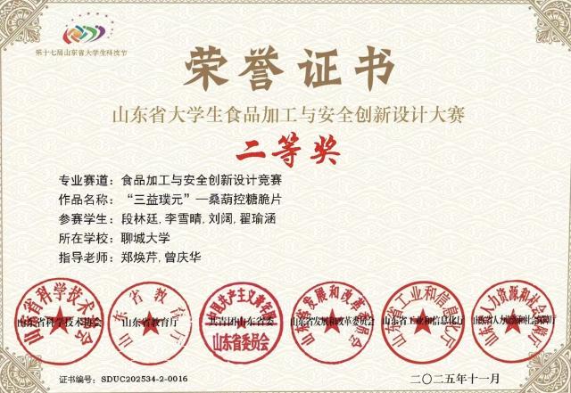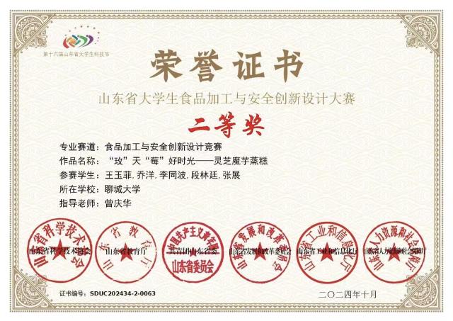 热烈祝贺药学与食品工程学院段林廷荣获山东省大学生食品加工与安全创新设计大赛二等奖