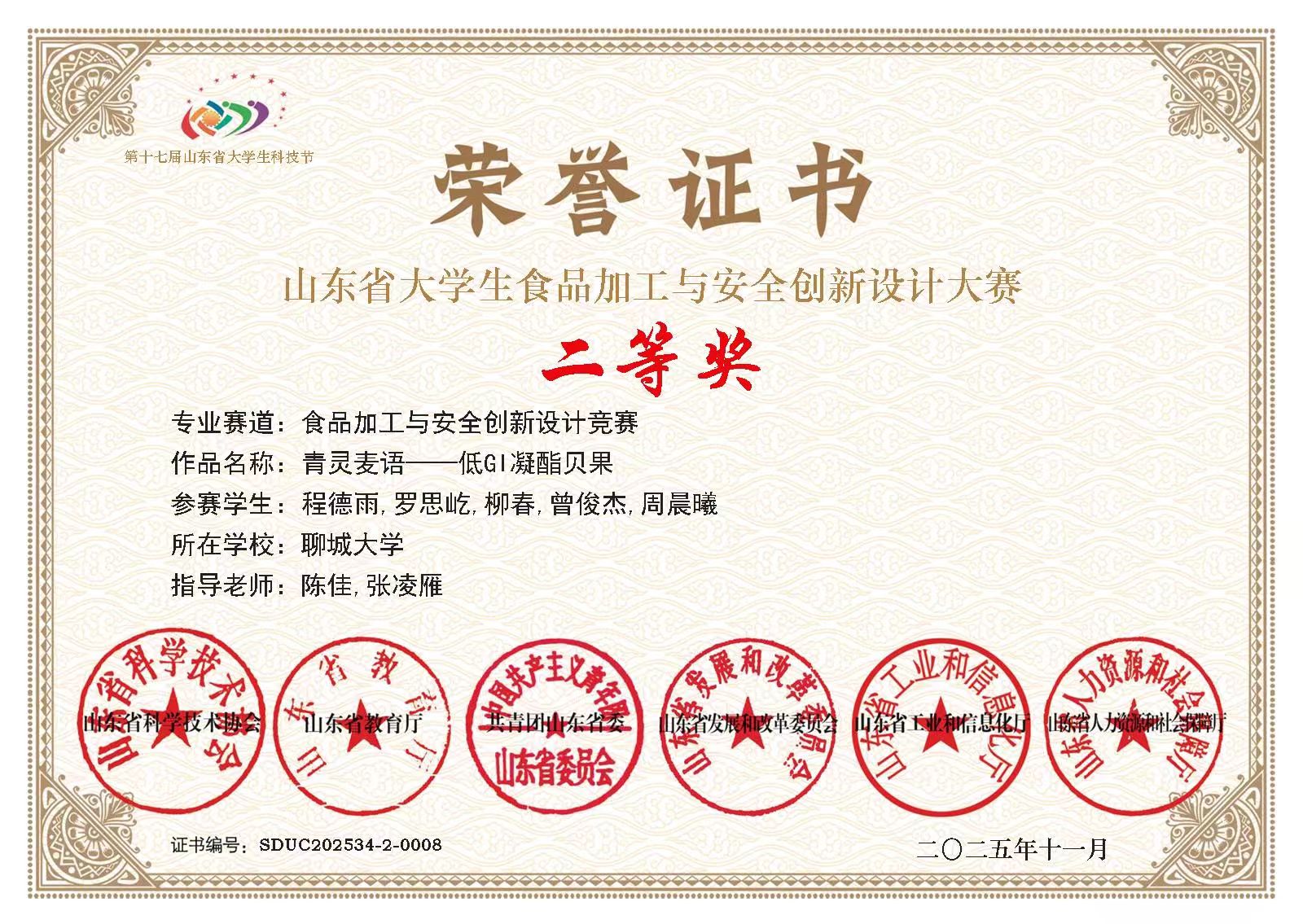 热烈祝贺药学与食品工程学院柳春荣获山东省大学生食品加工与安全创新设计大赛二等奖