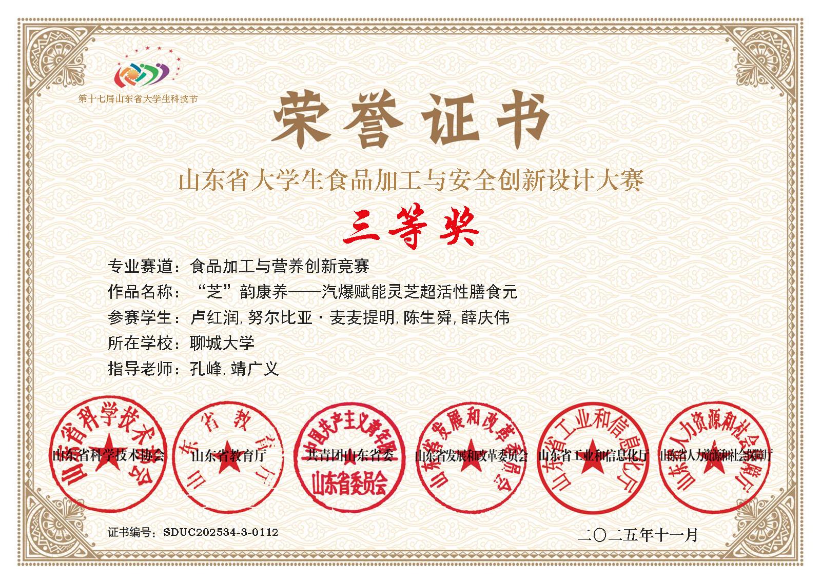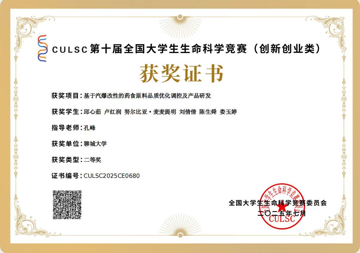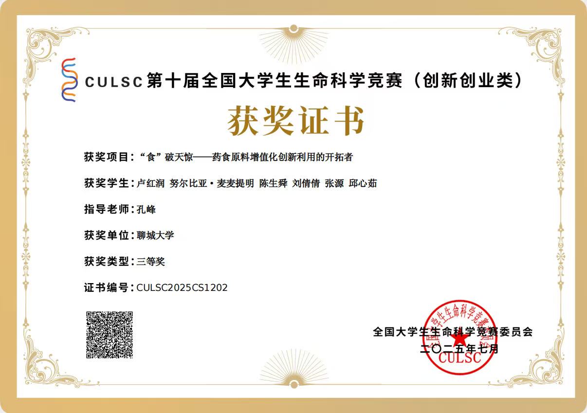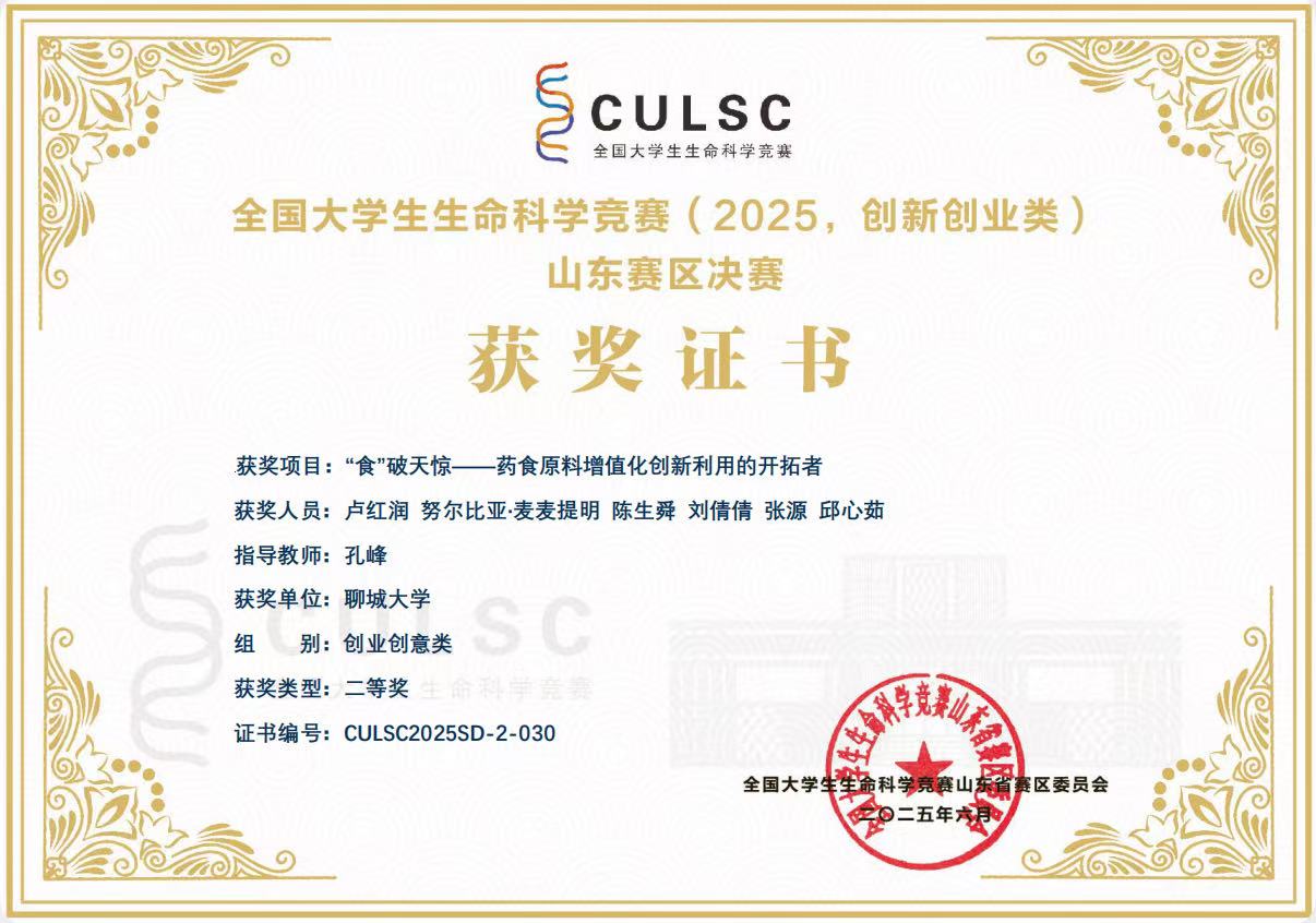 热烈祝贺药学与食品工程学院卢红润荣获全国大学生生命科学竞赛(2025,创新创业类)山东赛区决赛一等奖