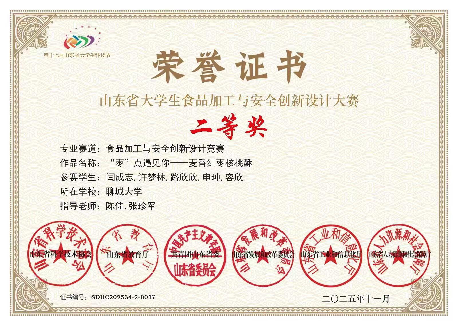 热烈祝贺药学与食品工程学院路欣欣荣获山东省大学生食品加工与安全创新设计大赛二等奖