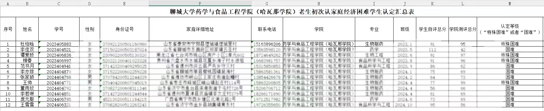 聊城大学药学与食品工程学院(哈瓦那学院)老生初次认家庭经济困难学生认定汇总表