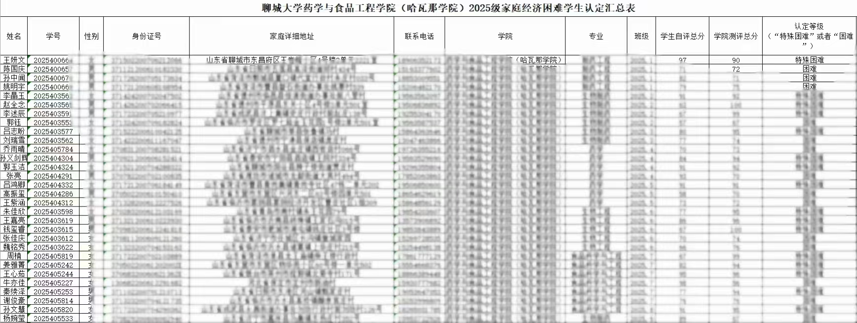 聊城大学药学与食品工程学院(哈瓦那学院)2025级家庭经济困难学生认定汇总表