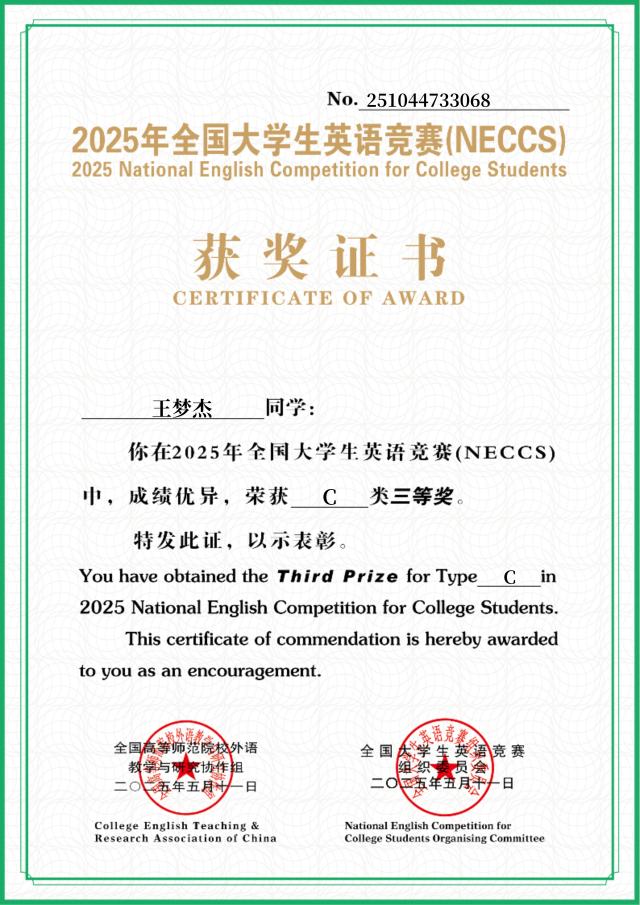 热烈祝贺药学与食品工程学院王梦杰荣获2025年全国大学生英语竞赛(NECCS)C类三等奖