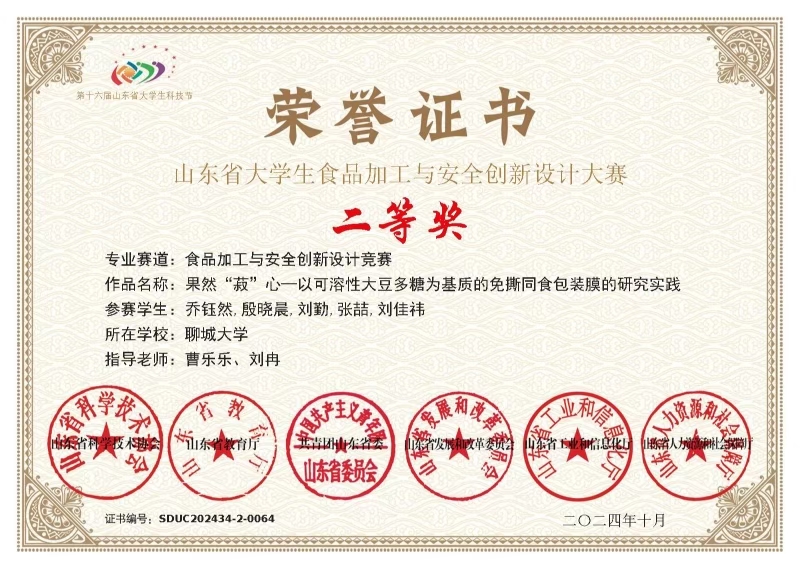 热烈祝贺药学与食品工程学院乔钰然荣获山东省大学生食品加工与安全创新设计大赛二等奖