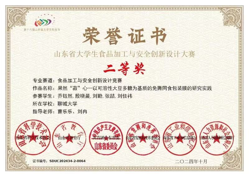 热烈祝贺药学与食品工程学院刘勤荣获山东省大学生食品加工与安全创新设计大赛二等奖